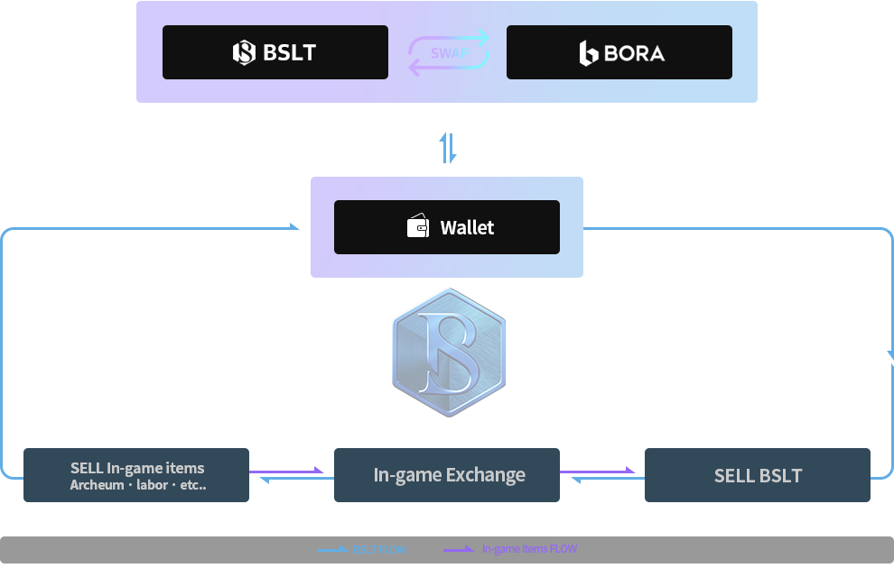 Thus, all in-game exchanges will be recorded on the private chain and when BSLT moves out of the game (i.e. to individual wallets, etc.), such transactions will be recorded on the public chain.